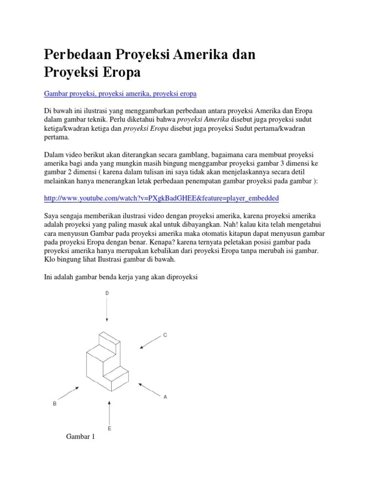 Ketiga/kwadran ketiga dan proyeksi eropa disebut juga proyeksi sudut pertama/kwadran pertama. Kuadran ini terletak di sebelah kiri bidang vertikal dan di bawah bidang horizontal. Proyeksi amerika berada di kuadran ketiga. Proyeksi yang dipelajari yakni amerika dan eropa. Perbedaan proyeksi amerika dan proyeksi. Perbedaan proyeksi eropa dan proyeksi amerika adalah bila proyeksi eropa gambar letak bidang dua dimensinya itu terbalik dengan arah . Proyeksi amerika & proyeksiâ eropa 11 08 2012 dalam membaca gambar teknik seringkali kita kebingungan akan perbedaan proyeksi amerika dan proyeksi eropa. Untuk lebih memahami pengertian gambar proyeksi dan praktek pembuatan gambar tersebut di atas kertas gambar, berikut ini akan diuraikan teknik dasar pembuatan . Lalu apa sih sebenarnya perbedaan proyeksi amerika dan eropa? 19032018 untuk lebih memahami pengertian gambar proyeksi dan praktek pembuatan gambar tersebut di atas kertas gambar berikut ini akan diuraikan . Jadi ada perbedaan kemampuan mahasiswa dalam. Proyeksi orthogonal ialah gambar proyeksi yang sektor prediksinya memiliki sudut .